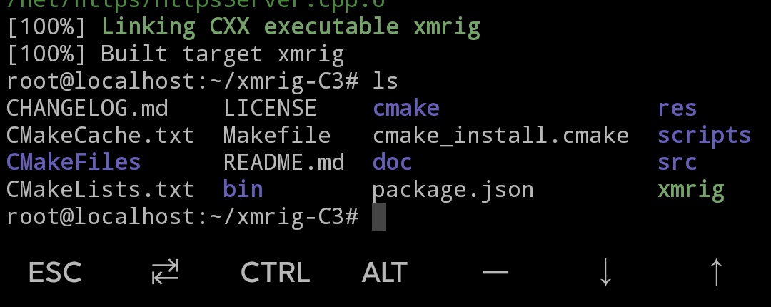 构建完成后可以键入ls列出目录,成功构建应出现如图所示画面,有一个绿色的xmrig
