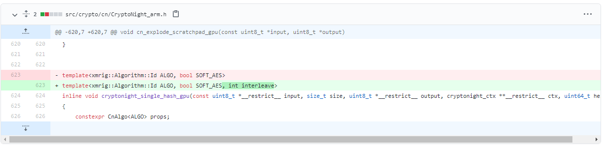 将623行的template<xmrig::Algorithm::Id ALGO, bool SOFT_AES>改为template<xmrig::Algorithm::Id ALGO, bool SOFT_AES, int interleave>。即在后尖括号前添加, int interleave。然后退出。