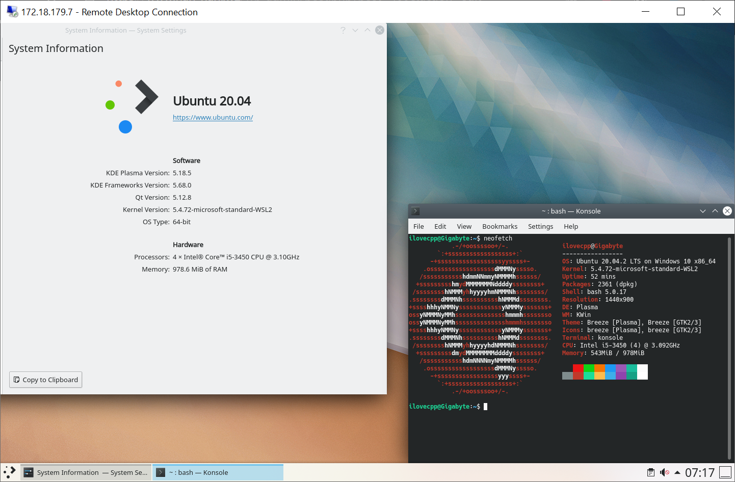 重新启动后,启动安装的WSL发行版,创建初始账户,更新包,然后安装xrdp、dbus-x11、kde-full(这将会占用您大约3.7GB的磁盘空间),