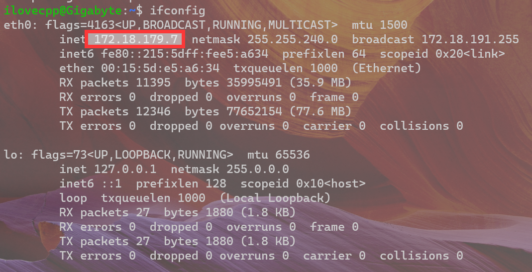 在终端输入:ifconfig,若没有该包则使用sudo apt install ifconfig -y && ifconfig,并记住红框内的数字(每次启动均不同)
