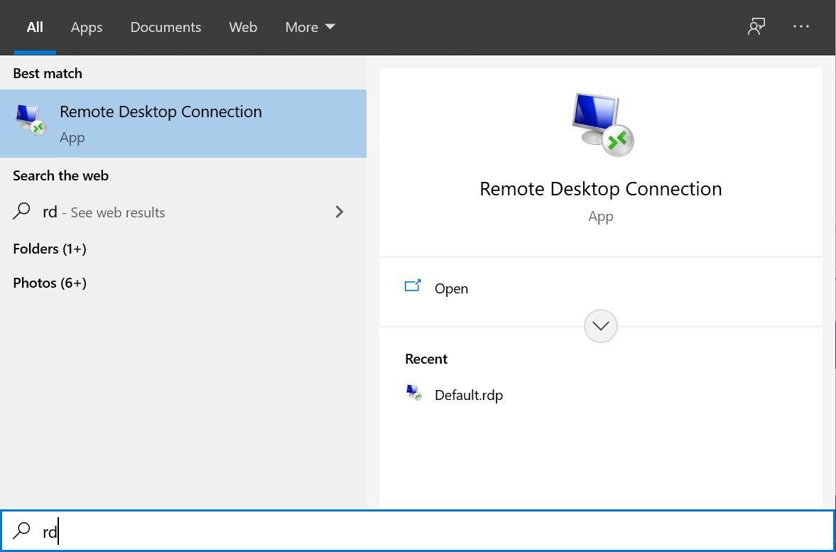 然后在Windows下启动远程桌面客户端(按下Win+S并输入rd选择如图选项即可)