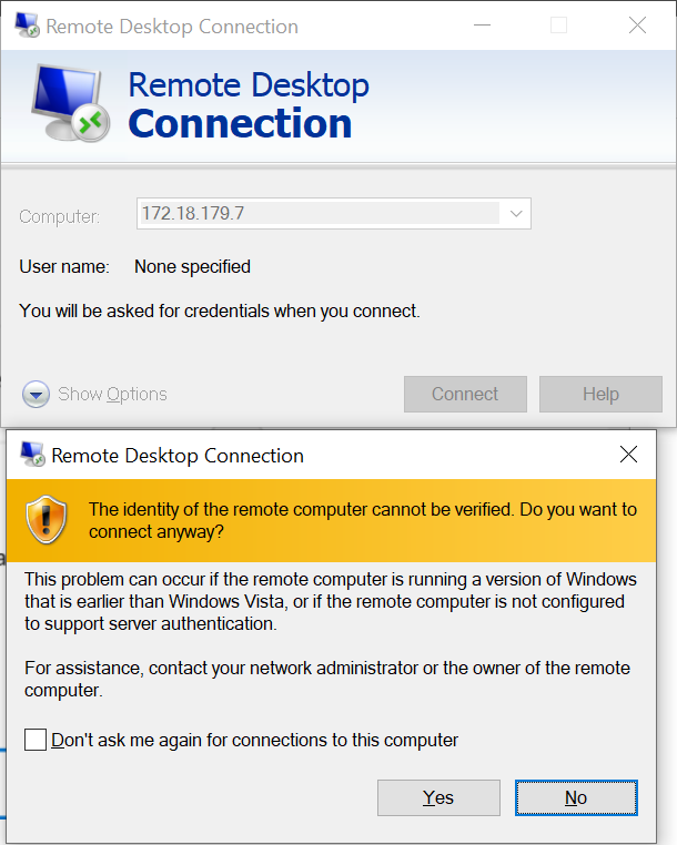 然后远程桌面客户端会提示有安全风险,直接确定即可。