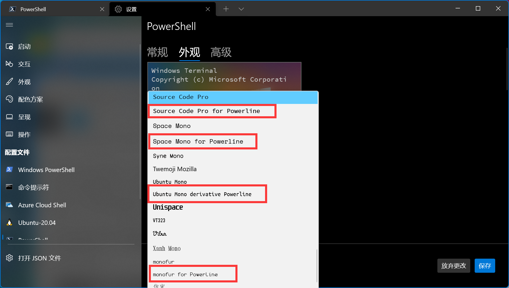 部分字体可能会出现不兼容的情况导致部分乱码,如上图,我这里建议采用Source Code Pro字体。或者克隆这个仓库,并使用PowerShell运行install.ps1再选择后缀带for Powerline的字体,如下图